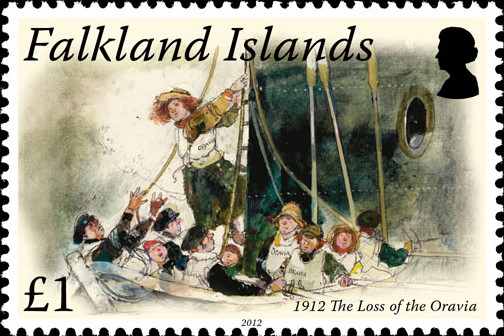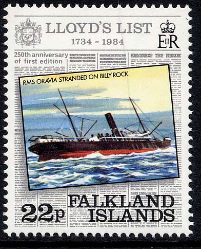 1900-1912. A steel, twin-screw steamer built in 1897 by Harland and Wolff, Ltd., Belfast, for The Pacific Steam Navigation Company, having a gross tonnage of 5,321, net 3,318 on dimensions 421 ft. x 48 ft. 8 in. x 33 ft. depth. Two triple-expansion engines developed 568 nhp. The PSNC held the mail contract for the Falkland Islands colony from 1900 to 1917 and their vessels called at Port Stanley on the outward and homeward voyages to and from Valparaiso or Callao. On November 12, 1912, the Oravia was wrecked on the Billy Rock, Port William, Falkland Islands. No lives were lost.