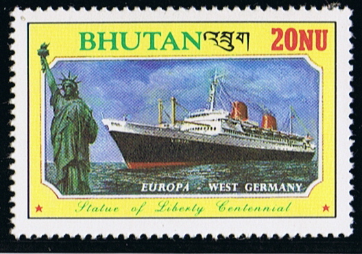 This $1.00 stamp is the Europa, formerly the Kungsholm, built in 1953, by De Schelde N.V., at Flushing, for the Swedish American Line's North Atlantic service between Gothenburg and New York and for cruising during the winter months. A fine-looking ship with her raked stem, cruiser stern and two masts and funnels, her forward funnel is a dummy, which houses a large grille for interior ventilation. She was launched by Princess Sibylla of Sweden on April 18, 1952. Towards the end of 1965 she was bought by the Norddeutscher Lloyd, of Bremen, and renamed Europa. Gross tonnage 21,514; net 11,484, length 600 ft.; beam 77 ft. 1 in.; draft 26 ft. 3 in.; depth 48 ft. 11 in. She was strengthened for navigation in ice. When acquired by the N.D.L. she was sent to Bremerhaven for reconditioning, her hull being repainted black.