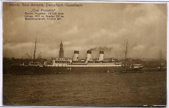 Built by Blohm and Voss, Hamburg, for Hamburg-South America Line. Fitted out for her maiden voyage when war broke out in 1914. It was decided to arm her as a merchant raider under the name of Vineta but the plan was scrapped and she was decommissioned and reverted to her original name. After hostilities she was allocated to USA for reparations, but was transferred to Britain to be managed by P&O. However, she was handed over to Union Castle and painted in the Company's colours. She was not a success and only made one voyage to South Africa for Union Castle. The company gave her back to the Shipping Controller and P&O were again given her to manage but her performance proved unsatisfactory. She was eventually sold back by the Government to her original owners. For a time she was used for cruising and in 1933 became a floating exhibition hall and then laid up for two years before being sold for scrap in 1935.