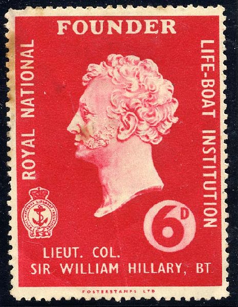 This poster stamp shows Lieut-Col Sir William Hillary, Bt., founder of the lifeboat service. A remarkable and versatile man, he had been equerry to one of the sons of George III, had traveled, had sailed round Sicily and Malta in an open boat, had raised a battalion for home defence in the Napoleonic Wars (an early Home Guard), and had been made a baronet for his services. In middle age he settled in the Isle of Man, at Douglas, and went out with other men in open boats to help many shipwrecked mariners off the island. It was these experiences which made him publish, in 1823, an appeal for a national lifeboat service.As a result of this appeal a meeting was held in the City of London on March 4, 1824, and the society which is now the Royal Life-Boat Institution was founded. Hillary outlined a complete plan for the service, which was responsible for the rescue of the shipwrecked, should have branches all around the coast, with volunteers enrolled ready to go to the rescue.