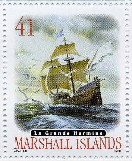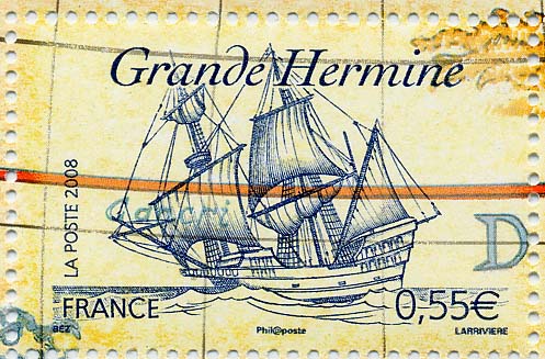The La Grande Hermine was a French galleon-type sailing ship of 120 tons displacement built around 1534 and used as the flagship of the explorer Jacques Cartier on his expeditions to Canada in 1535 and 1536 in which he discovered and named St Lawrence's bay. Ship given to Cartier by the King after the second voyage. After third voyage she was used in the merchant service.The La Grande Hermine had three masts, the fore and main square-rigged the mizzen lateen-rigged, carried a crew of 112 and was armed with 12 guns.