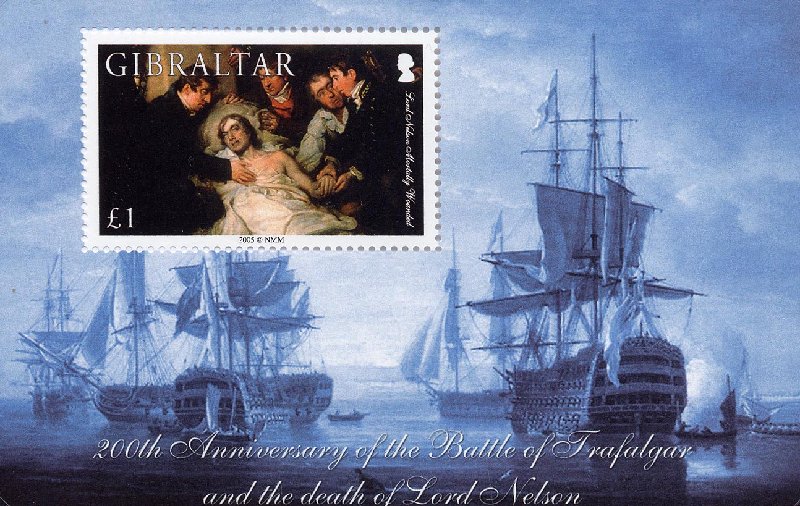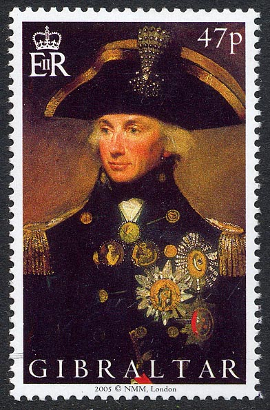 The portrait by Lemuel Francis Abbot, used for the 47p Gibraltar stamp (5) shows Nelson wearing his foreign decorations including the chelengk, given to him by the sultan of Turkey, in his hat.