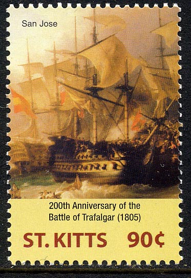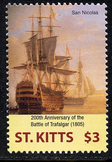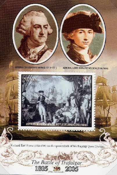 Nevis issued a min-sheet (10) for Trafalgar 200 showing the Mather Brown painting of Lord Howe on his Flagship QUEEN CHARLOTTE - Glorious First of June Battle. Nelson described Howe as "our great master in naval tactics and bravery". Above the stamp is the 1780 portrait of Nelson by Rigaud and also a portrait of Admiral Lord Hawke. Nelson favoured the tactics of Hawke who was adept at chasing and breaking enemy lines in seemingly impetuous and unformed attacks.