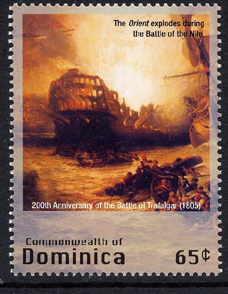 The Grenada mini-sheet of the 200th Anniversary of Battle of Trafalgar shows Nelson, Napoleon Boneparte, HMS Victory and, from a painting by William Marshall - "Nelson's Band of Brothers", but more correctly "Nelson explaining his plans for the Battle to his captains".(7)