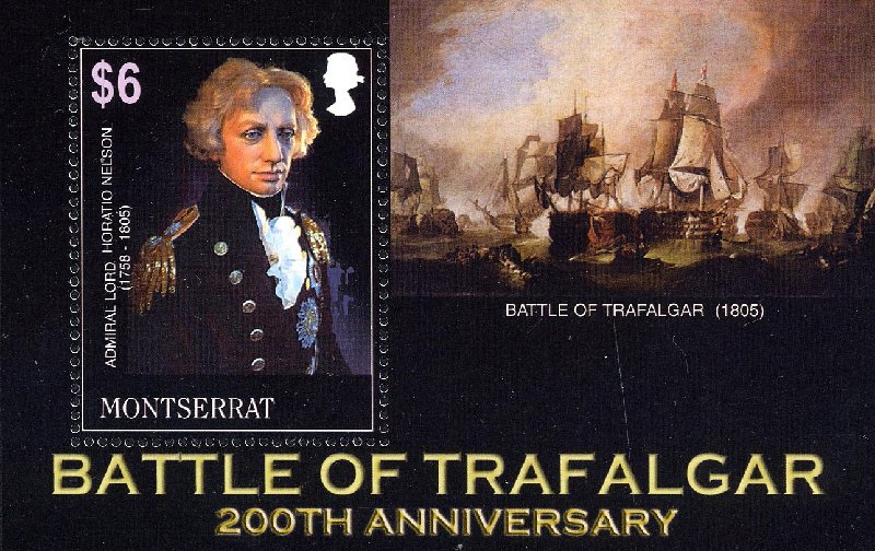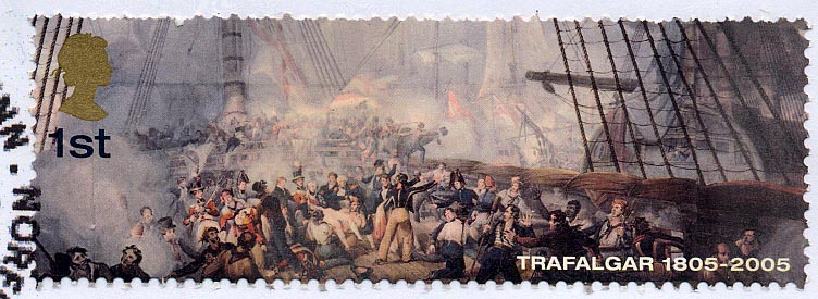 The stamp depicts a portrait of Admiral Nelson against the backdrop of the painting "The Battle of Trafalgar, 19 October 1805".