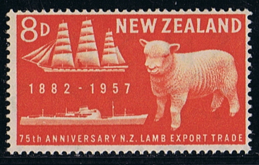 The meat producers Board asked the Post Office for philatelic recognition of the seventy-fifth anniversary of the beginning of the meat export trade (shown previously on the 6d 1940 Centenary). It was decided to issue two stamps, 4d and 8d, both featuring a New Zealand lamb. On the 4d it is astride an outline map of New Zealand and on the 8d it is beside an outline of the first refrigerated ship to leave New Zealand, the DUNEDIN, which carried 5.000 carcasses of lamb in 1882, and the modern mv PORT BRISBANE, which carries 350.000 carcasses in one third of the time.