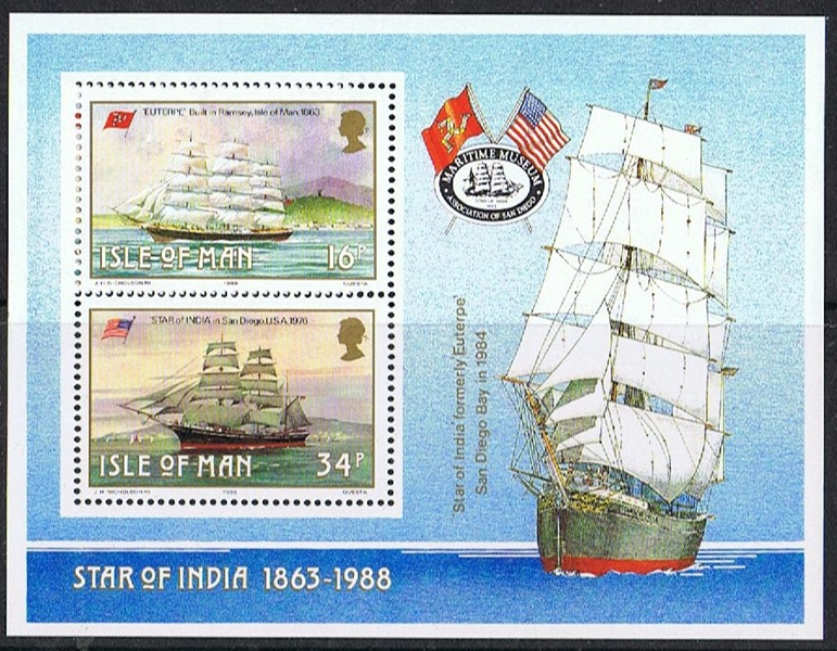 Isle of Man 1988 16p sg385, scott?, MSsg389, scott? ( the 34p stamp shows her as the STAR OF INDIA) 2019 1st sg?, scott?