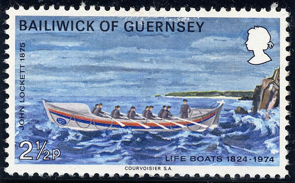 The first named life-boat to be based in Guernsey was the Louisa Hull. This was replaced in 1875 by the vessel depicted on the stamp, the John Lockett. The boat was a gift of Mrs. and the Misses Lockett, of Liverpool, and was at first stationed on one of the northernmost tips of the island. This situation was found to be too remote and the John Lockett was soon returned to the St. Peter Port base, where she served until 1888.