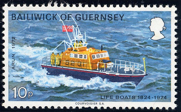 The 10p stamp in the set features the latest type (1974) of boat for the R.N.L.I., the Arun, costing £78,000, and built by William Osborne Ltd., at Littlehampton on the banks of the river from which she takes her name. She is designed to lie afloat and delivery of further boats of her class will enable the institutions fleet to be deployed to better advantage.