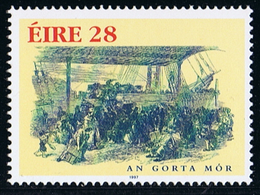 During the Great Irish Famine (in Irish An Gorte Mór) as given on the stamp, approximately one million Irish people died and an other million emigrated overseas mostly to the USA via Liverpool.