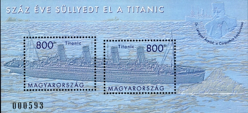 Magyar Posta is issuing an exclusive commemorative stamp block in memory of the Titanic and Dr Árpád Lengyel, the ship’s doctor on the first vessel to hurry to the aid of the TITANIC, the British steamship RMS CARPATHIA. The main motif of this unusual philatelic product is the TITANIC heading towards the iceberg, while the stamps show parts of the liner. In the top right corner there is a portrait of Dr Lengyel and the outline of RMS CARPATHIA. The unusual feature of this release is that, in addition to offset printing and embossing, iridescent spot-varnish screenprinting, usually a security device, has been used and the particles scattered across the surface sparkle icily. The first day cover for the block features a portrait of Dr Árpád Lengyel, while the silhouette of a lifeboat has been used for the special postmark. Forty thousand copies of the stamp block designed by the graphic artist Arnold Feke have been made by the banknote printing company Pénzjegynyomda.