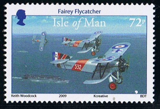 The Isle of Man stamp shows Fairley Flycatchers in the colours of 401 Flight from he Courageous Class aircraft carrier, HMS FURIOUS, over the Irish Sea in 1932. These aircraft were the main carrier-borne fighters available to the Fleet Air Arm from 1924-1932 and they served with the Home, Mediterranean and China Fleets.