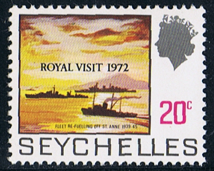 On the stamp she is showed re-fueling off Seychelles during World War II with HMS BELFAST and HMS RAPID.