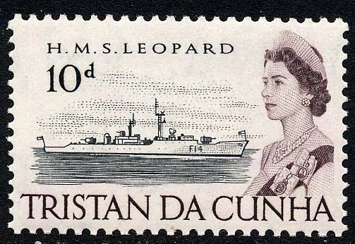 H.M.S. Leopard played an important part in the evacuation of the Tristan da Cunha islands in October 1961, when the settlement was threatened with destruction by volcanic lava. The Leopard landed shore parties on October 13 and they systematically searched each cottage and packaged, labelled and embarked the islanders' personal belongings. They also removed a considerable quantity of equipment from the lobster factory, meteorological station and radio station. One of their most unpleasant tasks was having to shoot a number of dogs on the island, but two puppies were kept by the crew and named Tristan and Cunha.