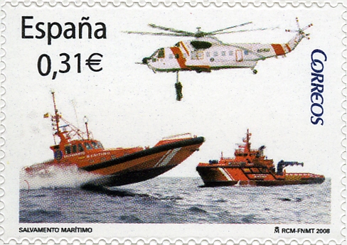 Lifesaving and cleaning of maritime waters and the fight against pollution, control of registration and flags flown by civil vessels, as well as the regulation of their dispatch, assistance, rescue, tugging, discoveries and maritime extractions, planning and control of maritime traffic, registration and control of civil maritime personnel are some of the tasks performed by maritime rescue (Salvamento Marítimo). The Sociedad de Salvamento y Seguridad Marítima , maritime rescue, was founded in 1992 as an organism belonging to the Ministry of Development ( Ministerio de Fomento) and the General Department of the Merchant Navy. Its organization is structured into Rescue Coordination Centres set throughout the 8.000 km of coastline and deal with all sort of emergencies and SOS situations at sea. In order to carry out these tasks, the Maritime Rescue Service has an aircraft and boat rescue fleet with rescue ships, tugs, speed boats, rescue helicopters and fixed wing aircraft all specially designed for life rescue and fight against pollution at sea. For this last purpose, Salvamento Marítimo also counts with oil-spill barriers and mobile tanks for oil storage and its transport to other parts of the country. Spain belongs to the International Maritime Organization, the UN specialized agency responsible for improving maritime safety and preventing pollution from ships and it's also committed to technical cooperation. Since seas and oceans have no borders, the Spanish maritime rescue service is coordinated with the maritime services of neighbouring countries creating a world rescue chain. On behalf of the IMO, it has been assigned responsibility over an area of a million and a half square kilometers, three times the size of Spain. The stamp depicts maritime and air units in rescue operations at sea.