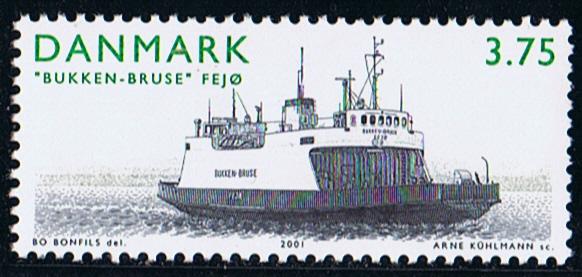 You can find her also on a label attached to Denmark 1995, a booklet containing four stamps showing Danish Islands. One pane depicts the ferries FAABORG II and ENDELAVE, the other BUKKEN BRUSE and FURSUND.