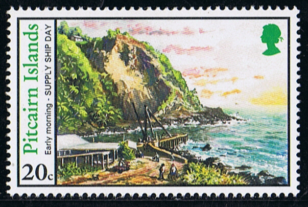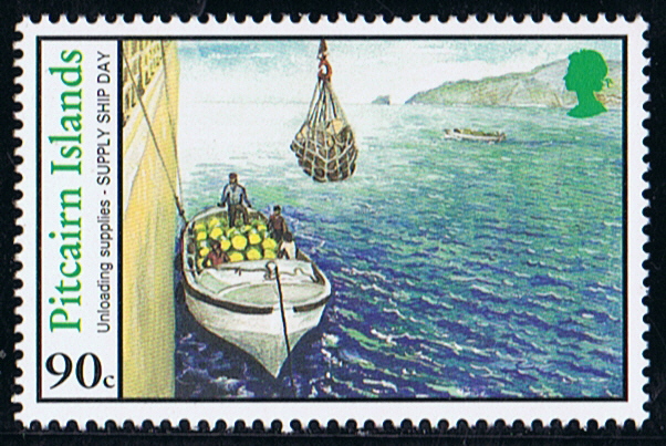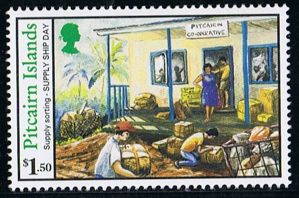 On supply ship day and on the day after, the Co-operative store is a place of intense activity as the $1.50 stamp in this issue shows. The Co-operative store was established in 1967 through locally contributed share capital. An elected committee operates the store and places orders for items through the Pitcairn Island Administration Office in New Zealand. The store was modified in 1989 and now has the appearance of a mini supermarket with self service checkouts at the door.