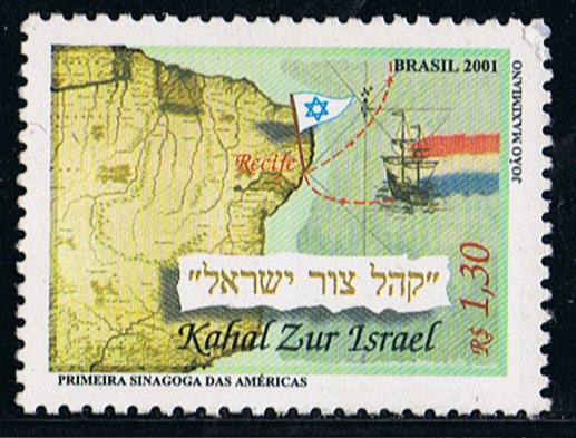 The stamp was issued by Brazil in 2001 to commemorate Kahal Zur Israel. The map, Nova et Accurata Brasiliae totius Tabula by Jan Blaeu, ca. 1662, forms the background, with a red dotted line indicating the arrival of Dutch Jews in Recife, and their departure to New Amsterdam. The ship (a caravel ???) and the flag of Israel and the Netherlands.