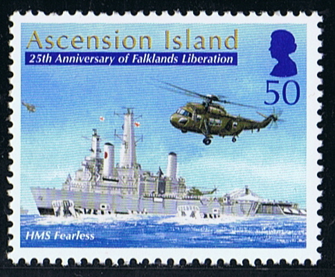 The Ascension Island stamp depicts her with a helicopter overhead and landing craft transporting supplies and men. The stern has been flooded to allow the landing craft to manoeuvre in and out the dock.