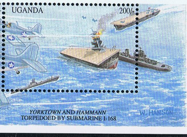 Australia 1992 $1.05 sg1341, scott1256 (the cruiser on the right is the HMAS AUSTRALIA.) Guinea 1991 150F sg1437, scott1161. Marshall Island 1992 sg425, scott314. Norfolk Island 1992 $1.05 sg530,scott524. Uganda 1992 200s sg1060, scott975j. U.S.A. 1992 29c sg2736, scott2697g.