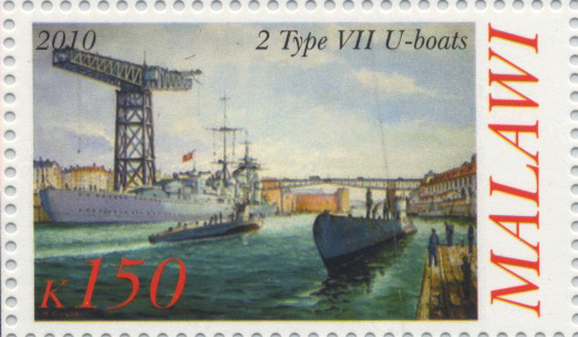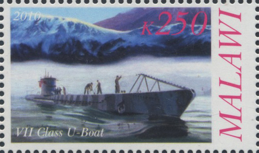 A German submarine is depicted on the 3 and 2 pfennig issue of the Armed Forces' and Heroes' Day set, issued by Germany in 1943. This is a U-boat of the Germania class, such as the (I¬45. Particulars of these are as follows —surface displacement 517 tons; complement 35; dimensions 213ft. x 19ft. x 13ft. armament; one 3.5in. gun, one 1-pounder A.A. gun, five 21in. torpedo-tubes (four bow, one stern); surface speed 16.5 knots, submerged 8 knots. A submarine officer is shown at the periscope of a submerged U-boat on the 6 and 4 pfennig stamp of the German 1944 Armed Forces' Day issue.