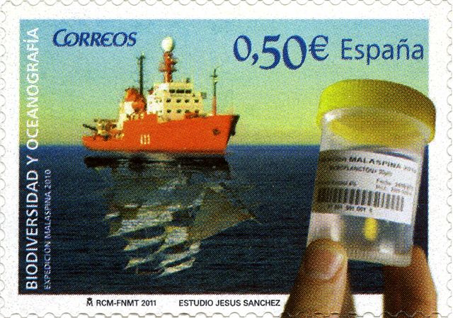 The stamp has been designed by Estudio Jesús Sánchez depicting the Hespérides and its reflection on the water featuring the Corbeta Atrevida, the original vessel of the first expedition commanded by Malaspina. The glass jar symbolizes the scientific nature of this expedition.