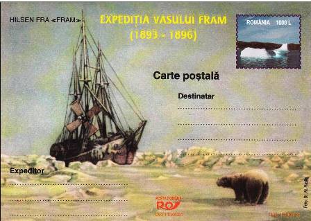 Nansen believed in bright, cheerful colours, and the Fram 's hull above the waterline was painted grey, the gunwale green, the poop scarlet, while red, white and green were the prevailing colours of the deck fittings. The whole expedition was fitted out most thoroughly—over £25,000 was expended upon the ship and her outfit, the vessel alone costing nearly £10,000. She is depicted on the first two stamps, with her two great navigators, Nansen and later Amundsen. She left Norway on June 24, 1893, and reached 85 deg. N., the farthest North any ship had been up to that time, and returned to Norway in 1896. In 1899 she was used by Sverdrup in his exploration of Jones Sound (Baffin Bay).
