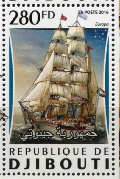 Chad issued 2018 a miniature sheet depicting “tall ships”, the ship depicted on the left is the Dutch bark EUROPA, the flag flying is the Dutch flag.