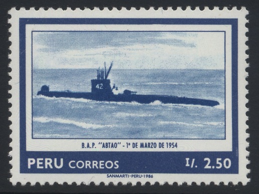 April 1957 her name changed to BAP ABTOA (S42), in memory of the naval battle of 07 February 1866 fought between the Spanish and Peruvian/Chilean naval squadrons. The Peruvians under Capt. Manuel Villar were victorious. Her motto was “Silence and assistance” in both times of peace and war.