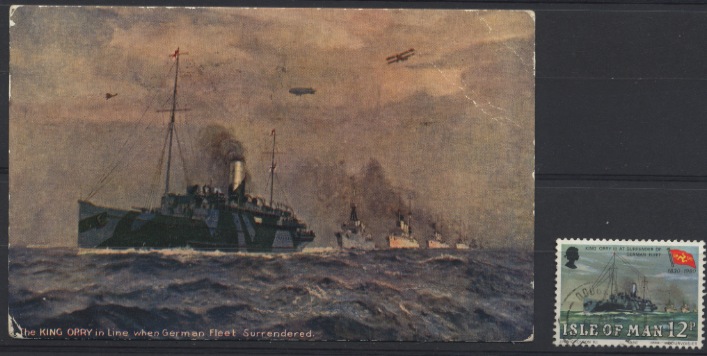 The King Orry, (1,877 gross tons), was built in 1913 by Cammell Laird at Birkenhead and was the first ship in the Steam Packet's fleet to have geared turbines. In 1914 she was taken over as an armed boarding steamer and worked from Scapa Flow. In the latter part of the war she was adapted for battle practice work and on November 21, 1918 was the sole representative of the British Merchant Navy at the surrender of the German High Seas Fleet.