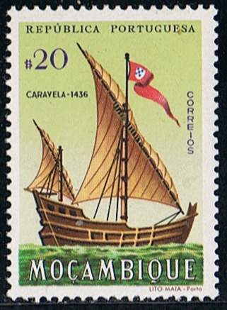 The Caravel Latina depict on this two stamps issued by Mozambique originates from the “Cáravo of the Moors”, a small vessel which sailed along the east coast of the Mediterranean.
