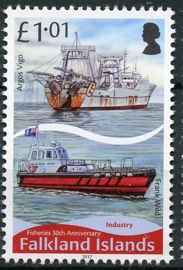 The fishing vessel ARGOS VIGO represents ‘Industry’ on the £1.01 stamp. She is owned and operated by Argos Group Limited and has installed a pioneering bird scaring system to its stern known as a fixed aerial array (FAA). The FAA is to discourage seabirds from seeking food during the fishing operation when they can become entangled in the nets and lines. This system is beginning to be adopted by other vessels in the fleet in preference over the ‘tori line system’ developed originally in the longline fishery. Industry and Fishery managers work together to ensure that the fishery operates to the highest environmental standards whilst protecting crew safety.