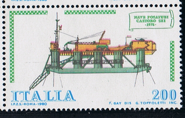 The Russian stamp depict the CASTORO SEI and some other ships used in the laying of the gas pipe line “Nord Stream” from Vryborg, Russia to Greifswald in Germany. (Wikipedia has much more on this pipeline)
