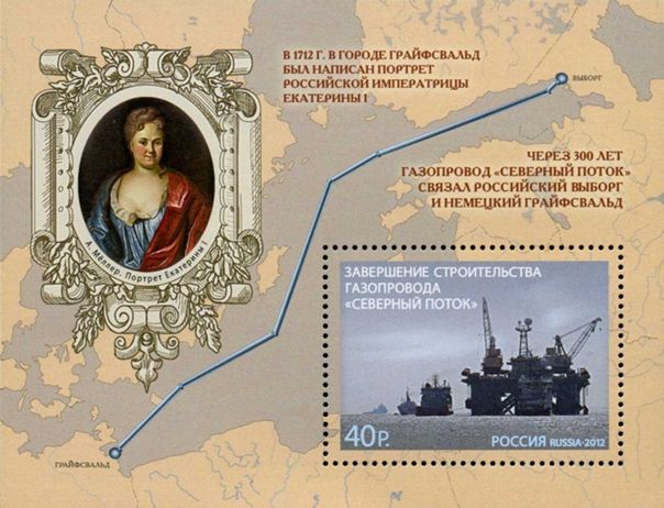 The margin of the stamp has the route of the pipeline, and a painting of Empress Catherine I (1712) painted by Andreas Møller and this painting was bought by Gazprom Germania GmbH in 2009, and is now at loan in the Hermitage Museum in St Petersburg.