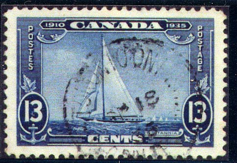 His Majesty's Cutter Yacht Britannia is depicted on the 3-cents Canadian Silver Jubilee stamp issued in 1935. She was built in 1893 for King Edward VII--then Prince of Wales—by Messrs. D. & W. Henderson, of Glasgow, to the design of Mr. 0. L. Watson, and was a complete departure from the craft of her period, being intended to skim the surface of the water instead of driving through it and her advent received much adverse criticism. The yacht was even considered unsightly because she had not got the clipper or swan bow, but after winning twenty first prizes in her first season's racing her critics were silenced, her nearest rival having won only eleven. During the Britannia's long racing career her sail plan was altered and the mast, removed from her in 1932, was presented to the Royal Alfred Aged Merchant Seamen's Institution by His Majesty King George V, and is now in use at their Belvedere home as a flagstaff.