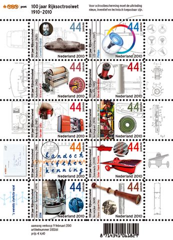 In 2010 The Netherlands issued a set of stamps for the 100 anniversary of the “Octrooi Wet” (patent act), one of this stamps is interesting for ship stamp collectors, the stamp depicts the first submarine built in the world by the Dutch inventor Cornelis Drebbel. The submarine did not fall in the timeframe of the patent act.