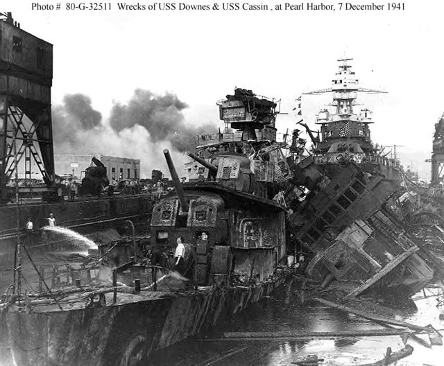 When the Japanese attacked Pearl Harbor 7 December 1941, DOWNES was in drydock with CASSIN (DD-372);and PENNSYLVANIA ( BB-38). The three came under heavy attack and an incendiary bomb landed between the two destroyers, starting raging fires fed by oil from a ruptured fuel tank. Despite heavy strafing, the crews of the two destroyers got their batteries into action driving off further attacks by Japanese planes. The dry-dock was flooded in an effort to quench the fires, but the burning oil rose with the water level and when the ammunition and torpedo warheads on board the destroyers began to explode, the two ships were abandoned. Later C ASSIN slipped from her keel blocks and rested against DOWNES. Listed at first as complete losses, both of these destroyers lived to fight again.