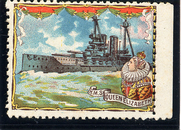 HMS QUEEN ELIZABETH. Battleship name ship of class, 27,500 tons. Built by Portsmouth Dockyard. Laid down 21 October 1912. Launched 16th October 1913. Completed January 1915.