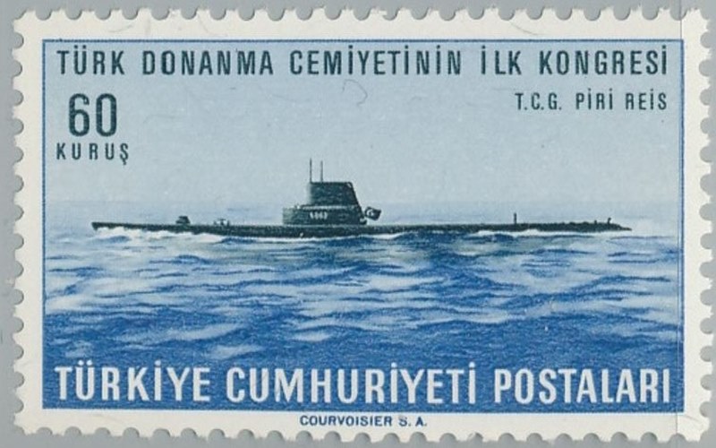 The Piri Reis is a welcome addition to the growing number of submarines depicted on stamps. She was formerly the U.S.S. Mapiro, of the "Balao" class, built by the Manitowoc Shipbuilding Company, launched on November 9, 1944 and completed on April 30, 1945. She is of all-welded construction with a high standard of accommodation, including separate messing and sleeping compartments. She was transferred to Turkey on March 18, 1960 at the San Francisco Navy Yard and renamed Pin Reis after a seaman and geographer who lived From 1475 to 1554. Reis participated in the Spanish campaign during which he rose to the rank of vice-admiral.