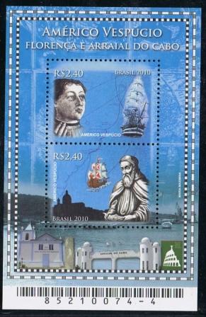 The features shown in the block are on a blue background, and are taken from the life of Amerigo Vespucci. These include maps, letters and panoramic views of Florence (Italy) and Arraial do Cabo (Brazil). At the bottom, to the left, there is an image of the Our Lady of the Remedies, from 1506, which was built out of mud slapped onto a wooden framework and was the first church to hold mass in Brazil together with the Amerigo Vespucci Obelisk, on Praia dos Anjos, which marks the place where the first Portuguese armada landed in 1503. At the bottom, to the right, there is the Gateway to Arraial do Cabo and the logo of the Year of Italy in Brazil, which will take place in 2011. The upper stamp portrays the Florentine sailor Amerigo Vespucci as a young man, and the lower stamp, shows him in his later years, when he was already known as the tamer of the New World and had also become famous for his tales of the newly-discovered lands. The stamps also feature typical 15th and 16th century sailing vessels.