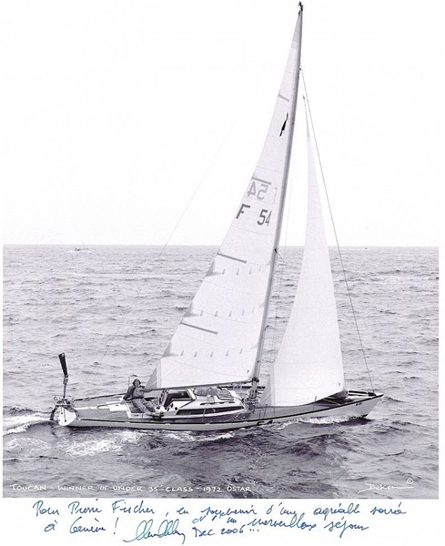 This TOUCAN was specially built by René Luthi's shipyard, for the French navigator, Alain Gliksman, who was looking for a boat to participate in the British single-handed Transat of 1972. He was seduced by this hull which "more resembled a projectile than a deep-sea yacht ". After winning the Great Race of the Week in Marseille, he faced the Atlantic, from Plymouth in England to Newport in the United States. He finished brilliantly 8th, after 29 days at sea, behind Alain Colas' Pen Duick IV, who won this legendary solo crossing.