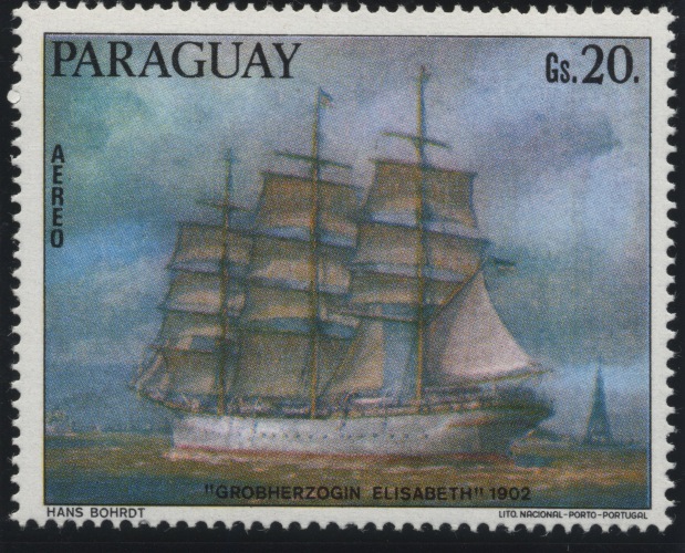 The Grossherzogin Elisabeth (I notice that there is only one "s" in the stamp design, a gross error!) is depicted on the Gs.20 Paraguay value after a painting by Hans Bohrdt (1857-1945). This steel full‑rigged ship was the first German cadet ship, a flush‑decked vessel of 1,260 tons. She was built in 1901 by J.C. Tecklenborg, at Geestemunde, for the Deutscher Schul SchiffVerein. Gross tonnage was 1,260, and length 223 ft. 6 in., breadth 39 ft. 4 in., depth 20 ft. 9 in. She was painted white, was beautifully maintained and perfectly sparred, a good example of what a small cadet‑ship should be. Until the end of the last war she was stationed at Oldenburg. After the war she was taken over by France as reparations and is now renamed by the French Navy as the Duc d'Alsace (can anyone verify this?), with a permanent home base in Brest Harbour.