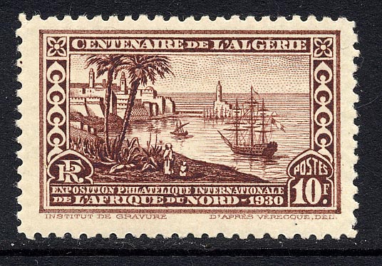 The Provence was the French warship which accompanied the first French settlers to Algeria in 1830 and for this reason is depicted on the centenary stamp issued in connection with the International Philatelic Exposition of "L'Afrique du Nord", held at Algiers. Incidentally this stamp appears to have been issued on white or cream paper, although I have seen only the latter cataloged: After the expedition to Algeria the Provence was renamed Alger, a tribute to the new settlement and to the ship which took part in it.