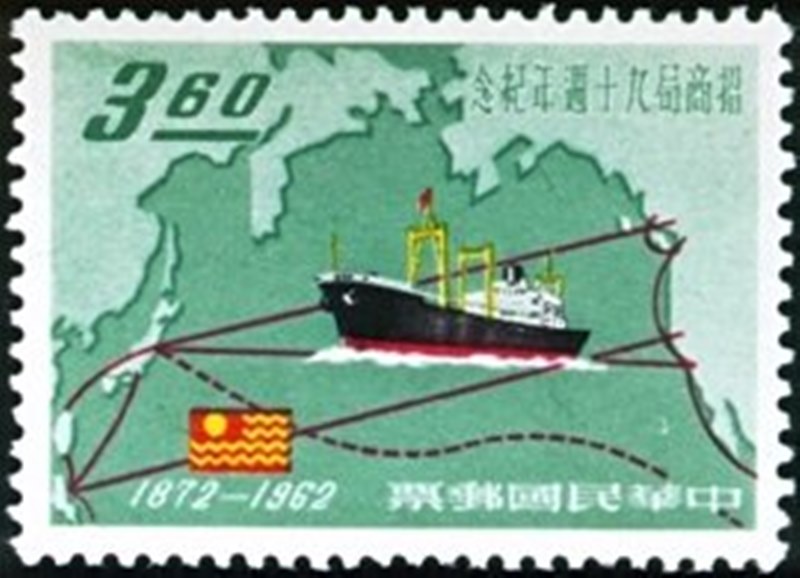 To commemorate the 85th anniversary of the China Merchants Steam Navigation Company, the Nationalist Government of Chiang Kai-shek on the island of Formosa (Taiwan) issued a set of three stamps in December, 1957 These show the latest motorship in the company's service, the Hai Min and one of the firm's early river paddle-steamers, the Kiang Foo. So finely engraved are these designs by Pao Liang-yu of the China Engraving and Printing Works at Taipeh that it is possible to read with a glass the name on the paddle-box.