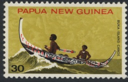 A Buka canoe, is depicted on the 30c stamp. There are two types of canoe used by the Buka people, both types are known as “mon” but variations of the mon have their own distinguishing names. There is a plank vessel (muna) which is a typical mon with curved high bifid ends. This can accommodate two men sitting side by side.