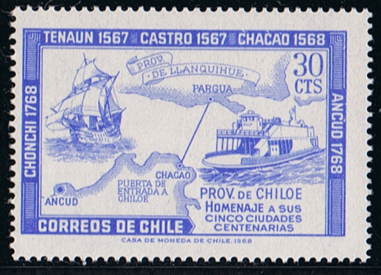 The stamp issued by Chile commemorates centenaries of five towns on the island of Chiloe with a map.