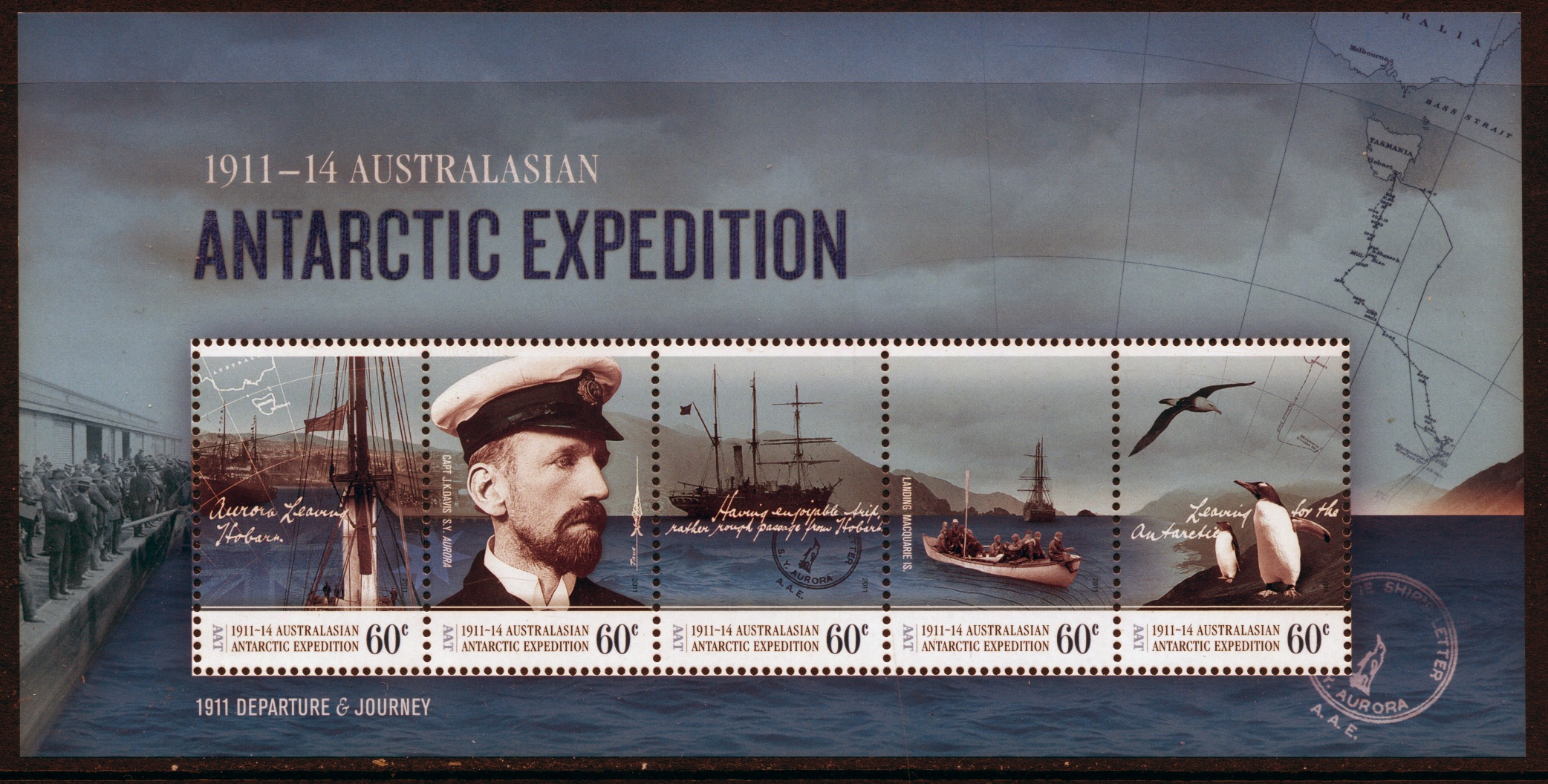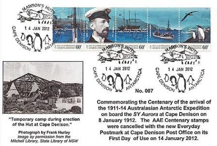 This is the first in a four-year program of stamps celebrating the centenary of the Australasian Antarctic Expedition (AAE). The series will be made up of five stamps issued each year until 2014 using the overall themes of departure and journey, arrival and exploration, science and triumphant return.