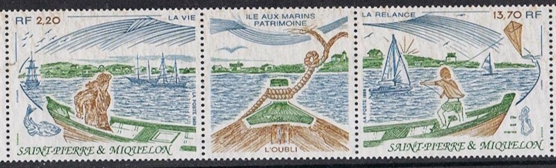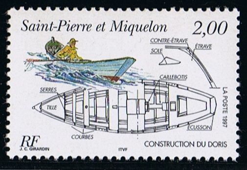 St Pierre et Miquelon 1955 10f sg 406, scott? 1967 25F. sg 442, scott C35. (the two cargo vessels on the left of the stamp are not identified.) 2012 0.60 Euro sg?, scott? http://www.shipstamps.co.uk/forum/viewt ... =2&t=16117. 1989 2f20 and 13f70 sg 616 and 617, scott 518 and 519 shows us in de foreground a "doris", on the 2f20 are in the background some sailing vessels. on the 13f70 stamp in the background is a surfboarder and a sailyacht.