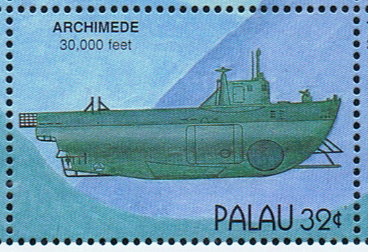 On January 28 1963, the French Post Office issued a 30 cents stamp depicting the bathyscaphe Archimede. It is of revolutionary bathyscaphe design and was launched at Toulon on July 28, 1961. Present at the launching was Dr. Jacques Piccard who in January 1960 reached the world record depth of 35,800 ft, in the bathyscaphe Trieste, now in the United States Navy, when he and Lieut. Don Walsh descended to the bottom of the Marianas Trench and stayed there for half-an-hour.