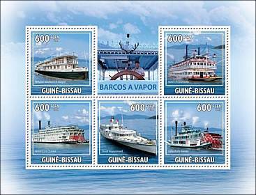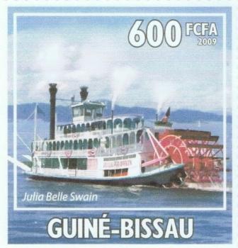 The JULIA BELLE SWAIN is one of five vessels shown on a miniature sheet issued by Guine-Bissau in 2009. In between the top two stamps is a photograph of the Julia Belle Swain’s wheelhouse.